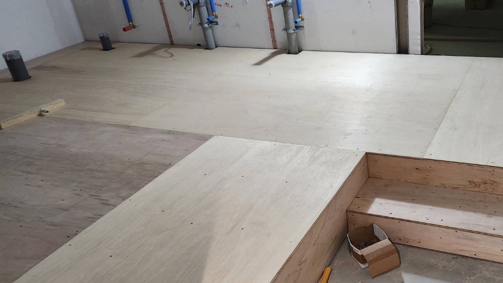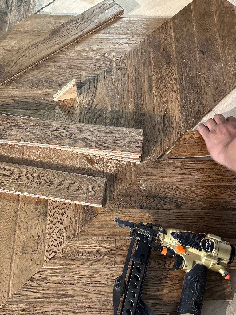 置き床の様な施工法と違い1枚1枚フローリングを貼り合わせて繋いでいくので時間を要しますが、何と言ってもデザイン性ですよね🤤✨